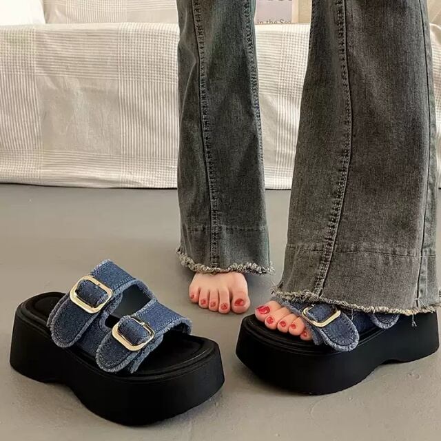【予約販売】サンダル レディース ブラック デニム ブルー 厚底 バックル スポーティー 可愛い カジュアル 靴 お洒落 ストリート 旅行 韓国 22.5cm/23cm/23.5cm/24cm/24.5cm/25cm