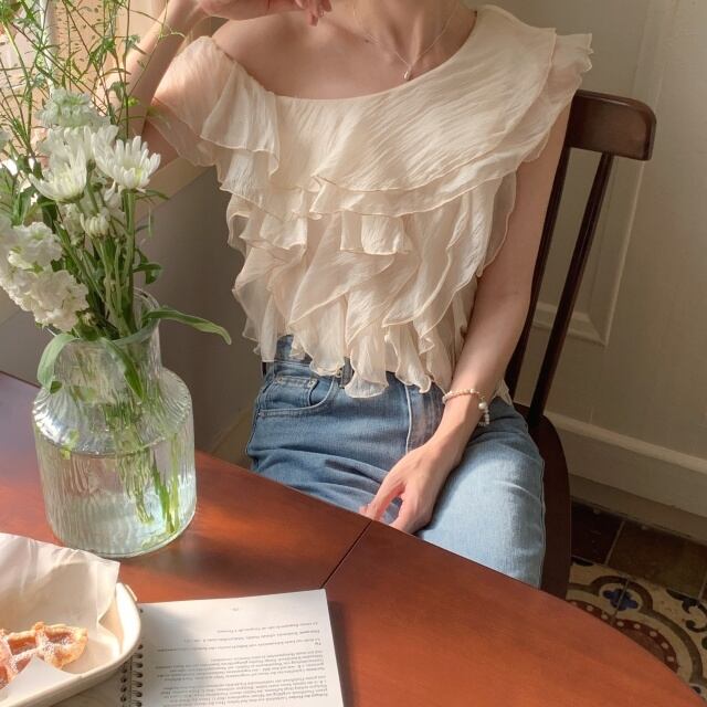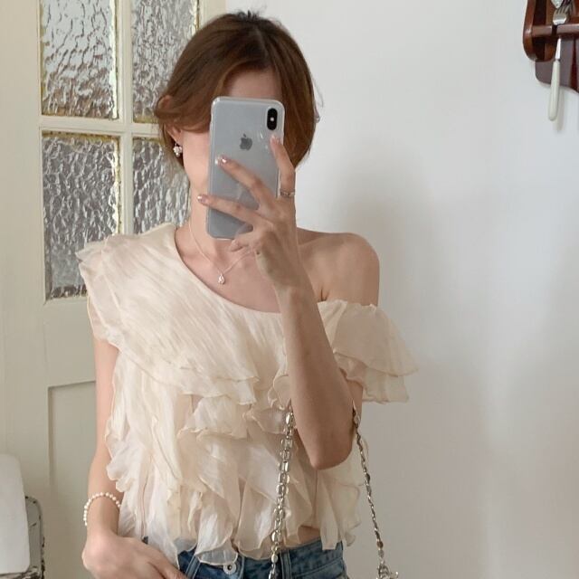 【予約販売】 トップス フリル 半袖 オフショルダー アイボリー アシンメトリー トップス レディース フェミニン こなれ感 大人可愛い おしゃれ 韓国 旅行 デート トレンド S/M