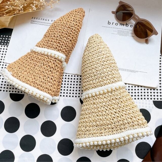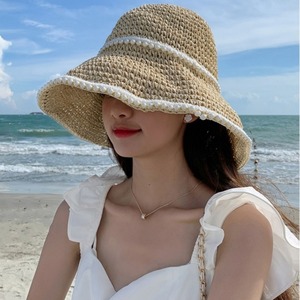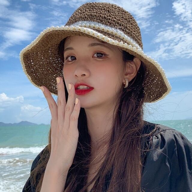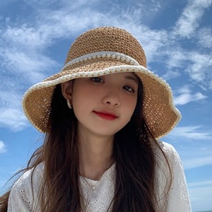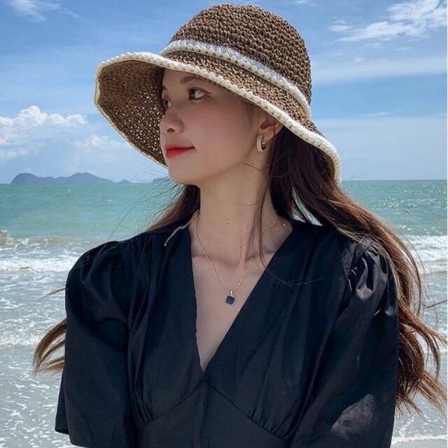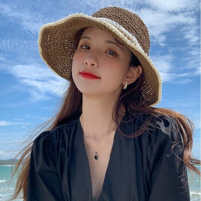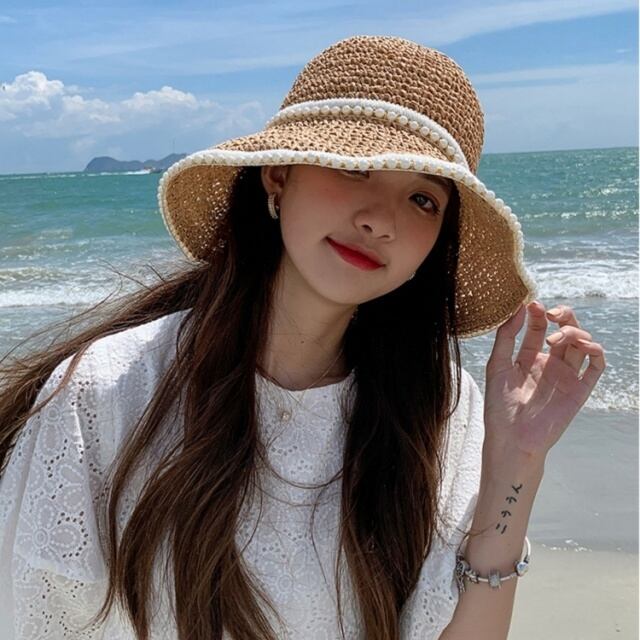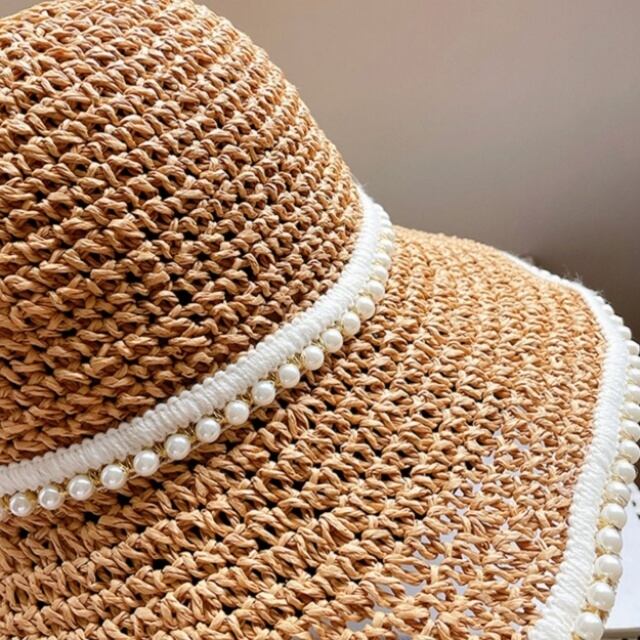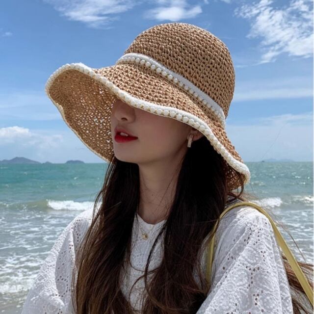 【予約販売】麦わら帽子 夏 パール ニット ハット 折り畳み コンパクト レディース アウトドア 可愛い 日焼け防止 紫外線 ベージュ ブラウン 女優帽 こなれ感 お洒落 韓国 トレンド