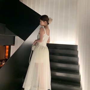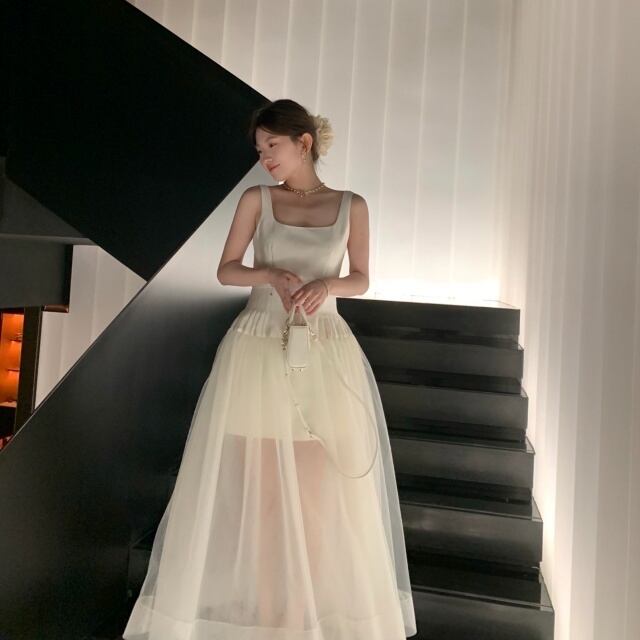 絶妙なロングのシアー感とミニスカートのレイヤードデザインが