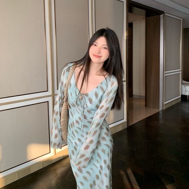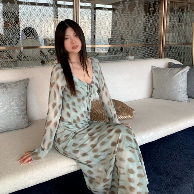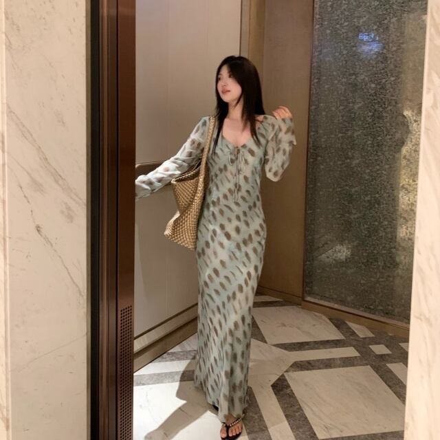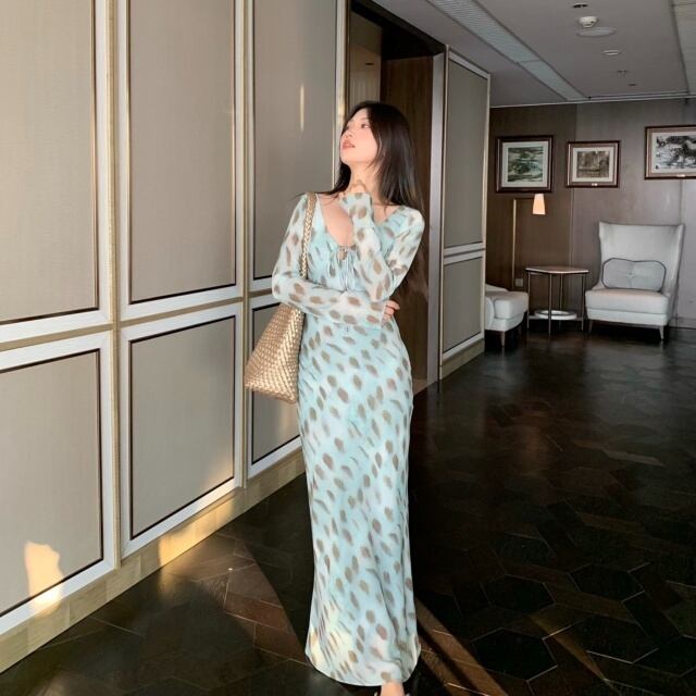淡いブルーの総柄で大人な雰囲気のロングワンピース。