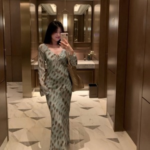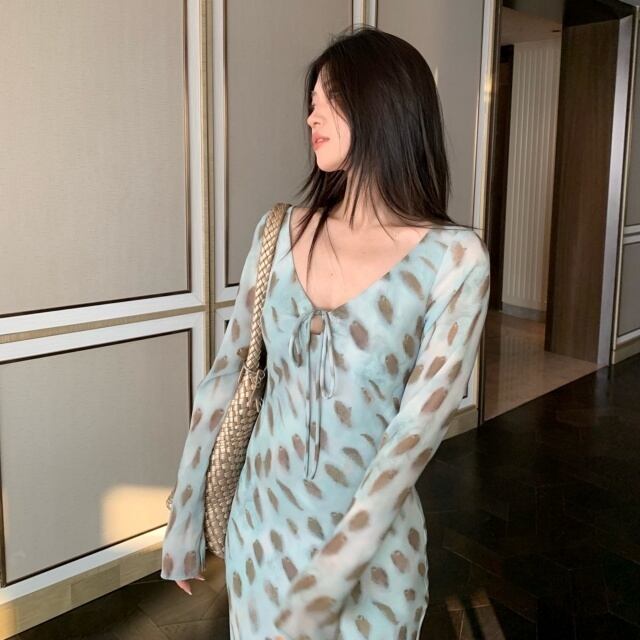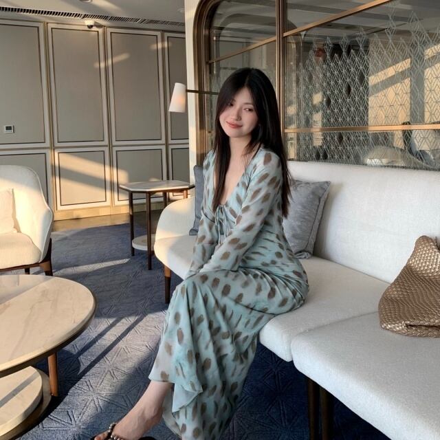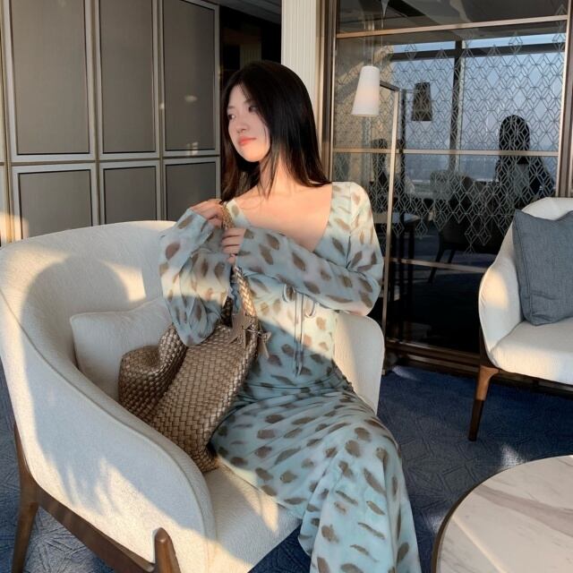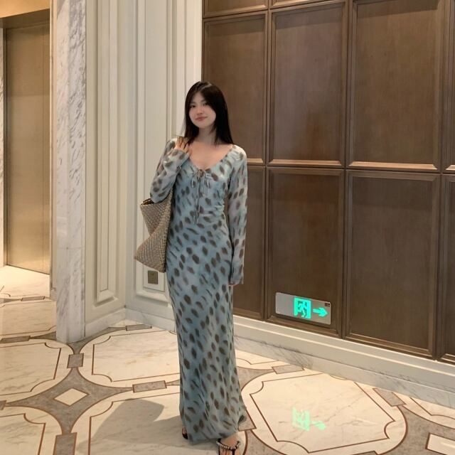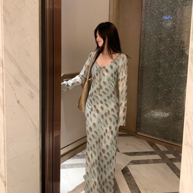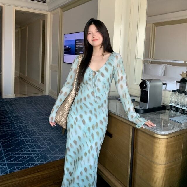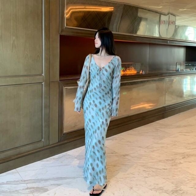【予約販売】ワンピース レディース 長袖 総柄 Vネック フレア ブルー ロングワンピース こなれ感 パーティー 結婚式 ワンピ 大人可愛い ドレス エレガント上品 韓国 S/M/L