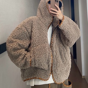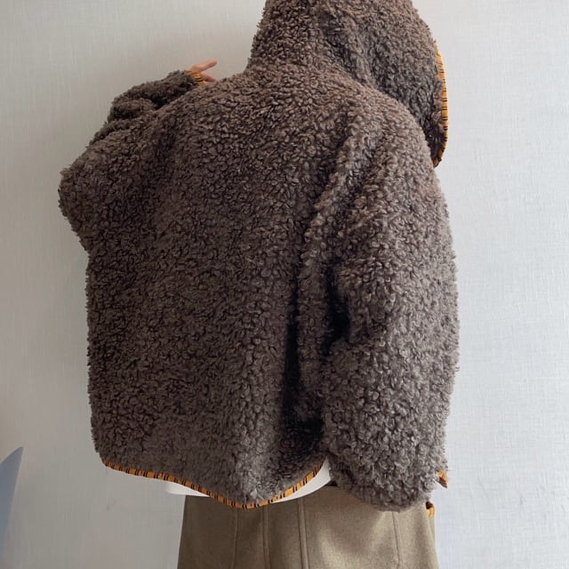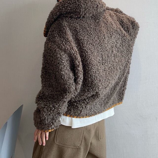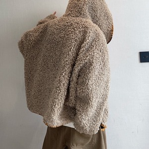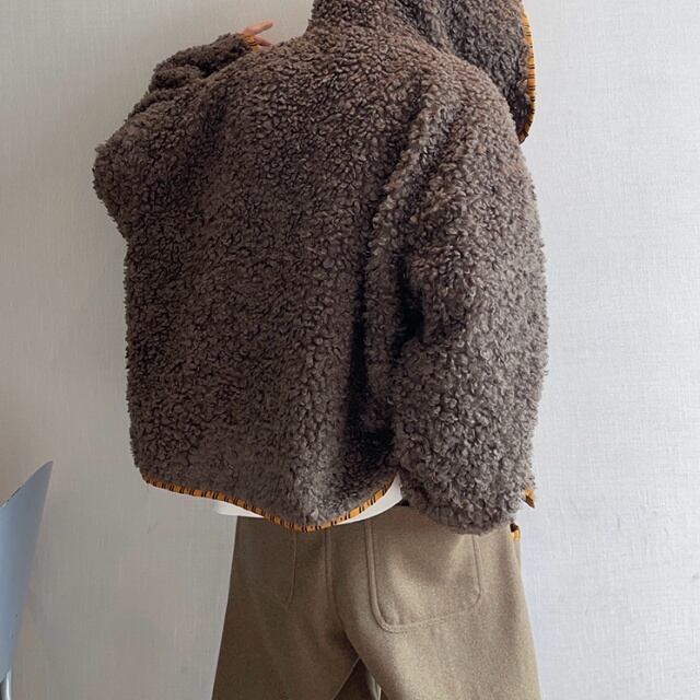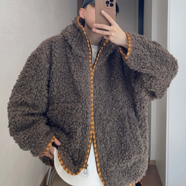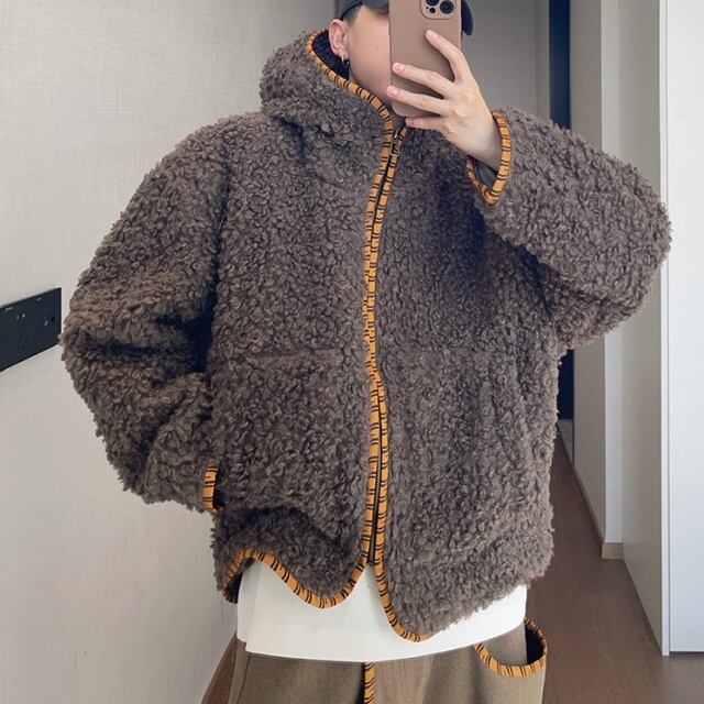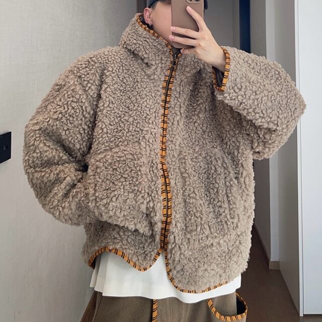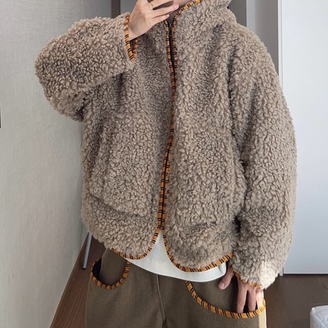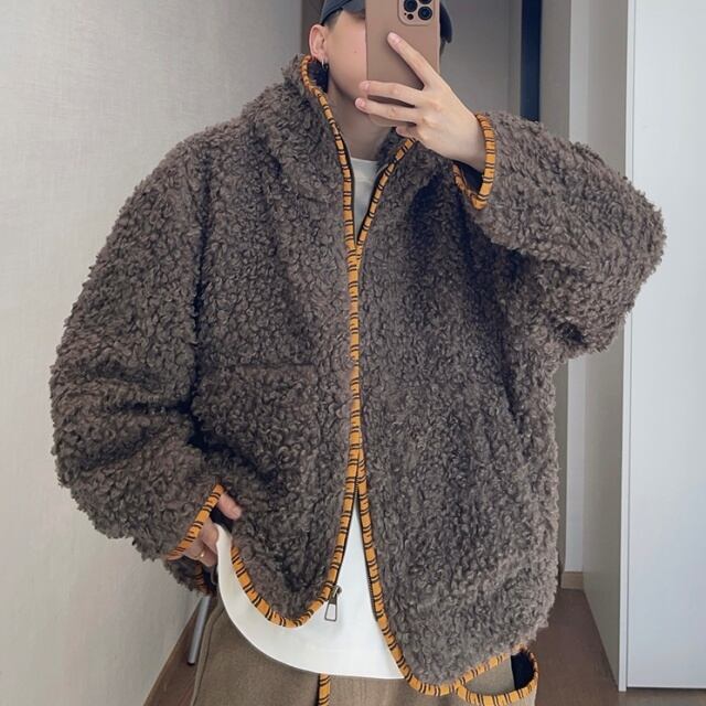 【予約販売】ボアブルゾン アウター パーカー フード付き 総ボア もこもこ 無地 ブラウン ベージュ 冬 防寒 ジャケット ショート丈 メンズ カジュアル 男前 こなれ感 お洒落 韓国 トレンド 秋 冬 M/L/XL/2XL