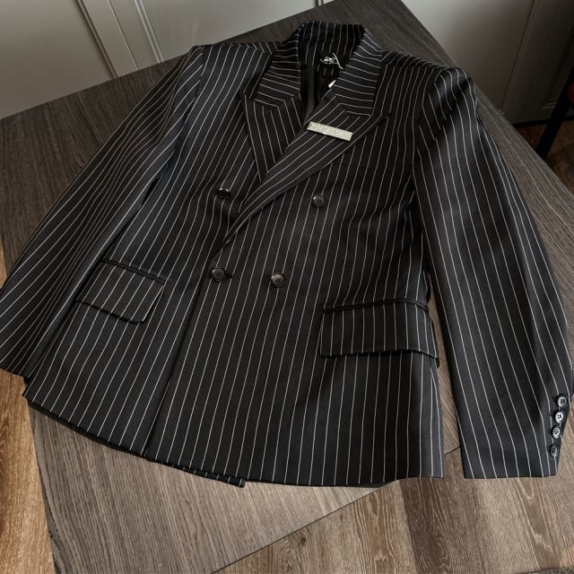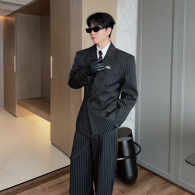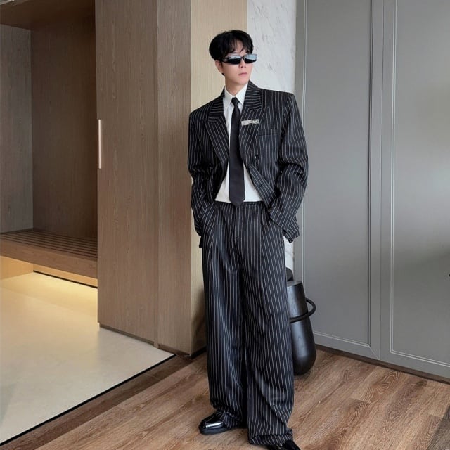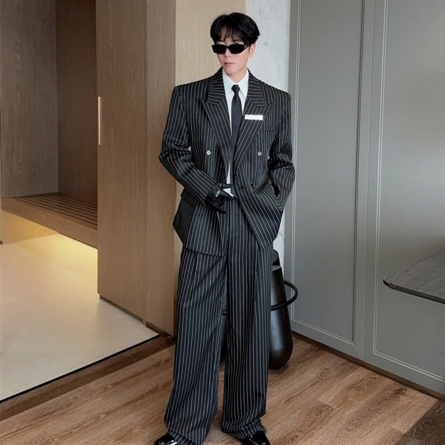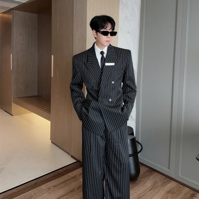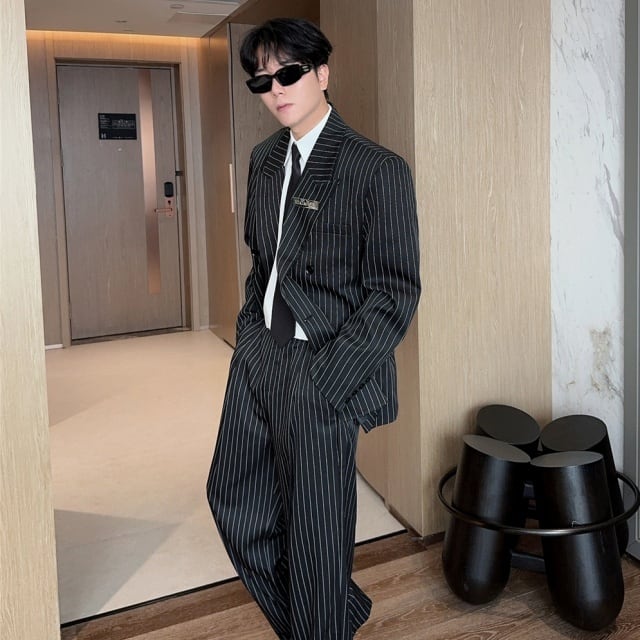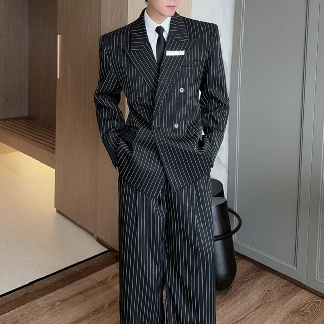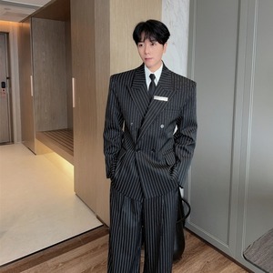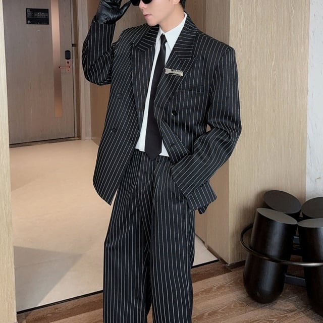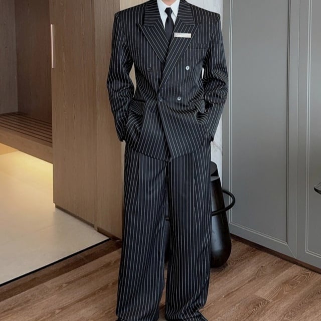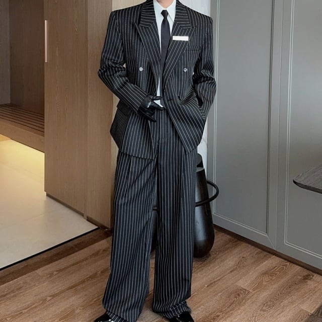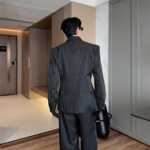 【予約販売】2点セット スーツ メンズ セットアップ 長袖 ジャケット ストライプ柄 男前 黒 ブラック 上下 パーティ お出かけ パーティー 二次会 結婚式 夏 M/L/XL