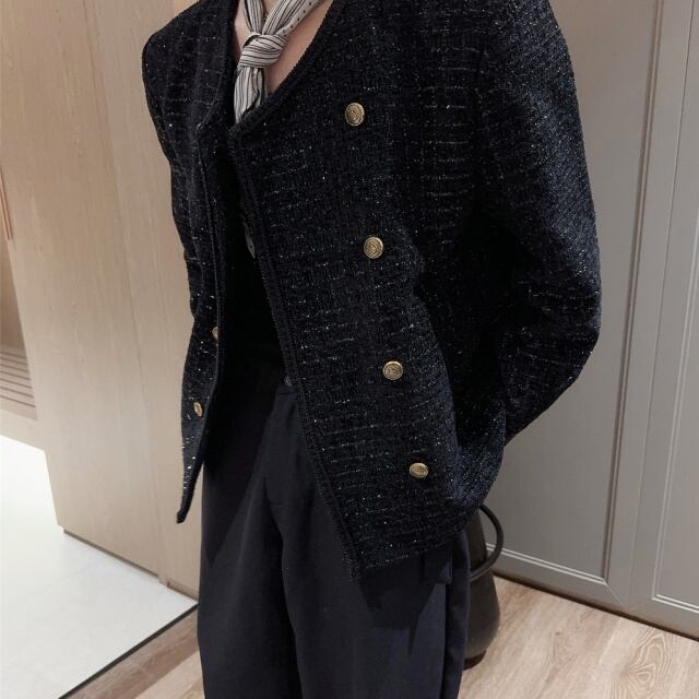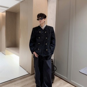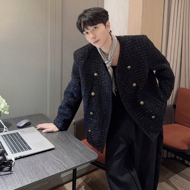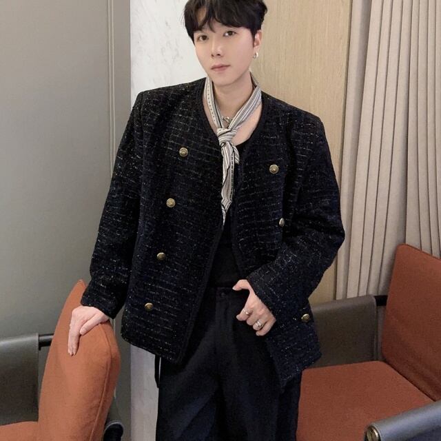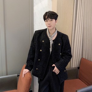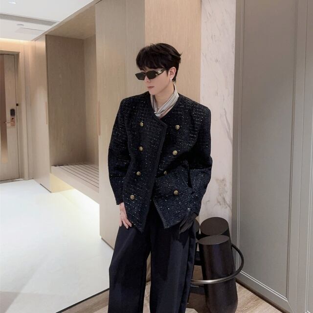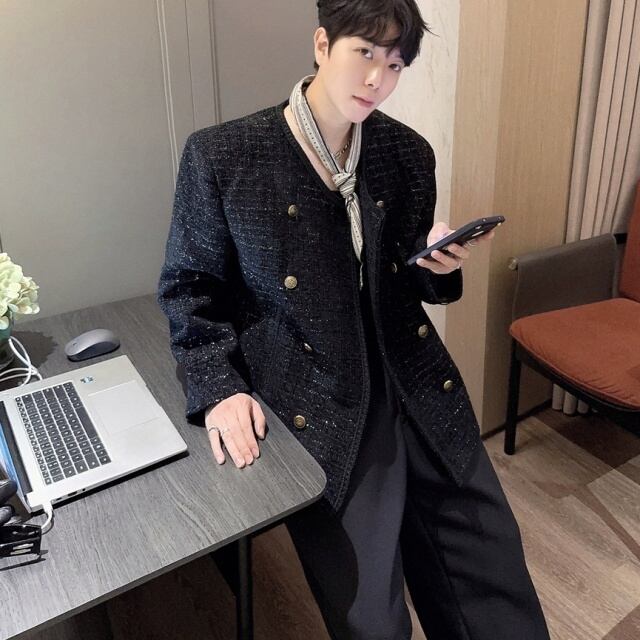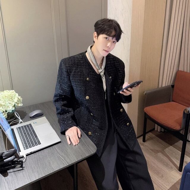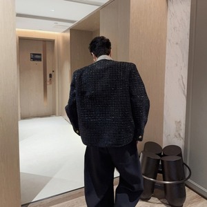 【予約販売】ジャケット ツイード メンズ ブラック ショート丈 シック ゆったり こなれ感 お洒落 韓国 トレンド 結婚式 M/L/XL