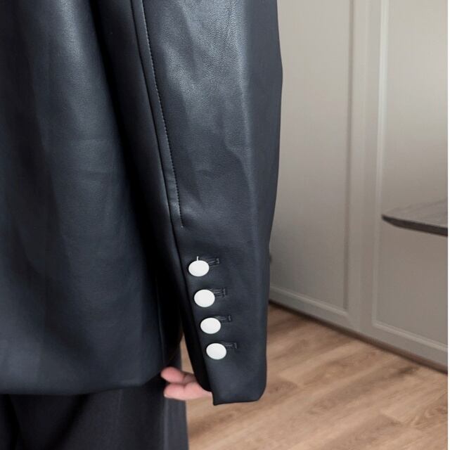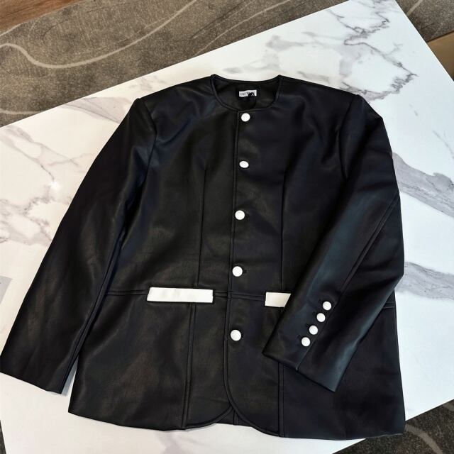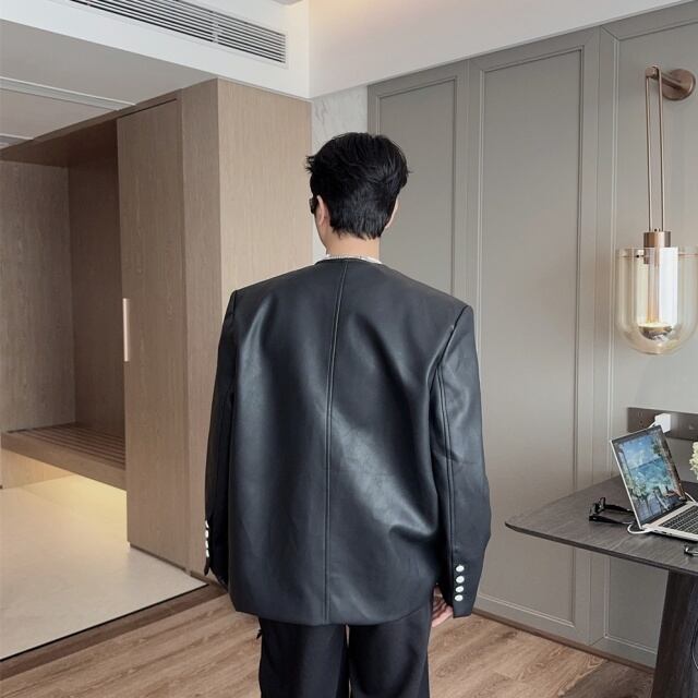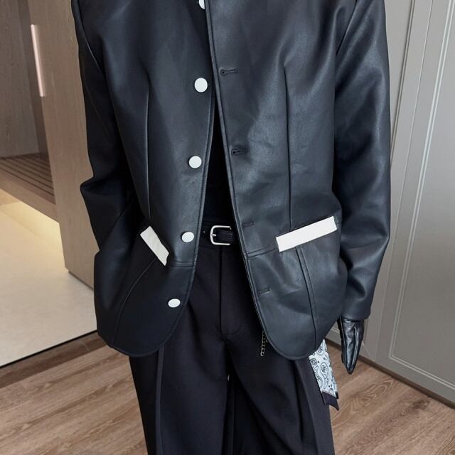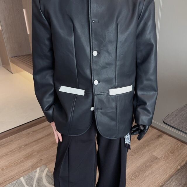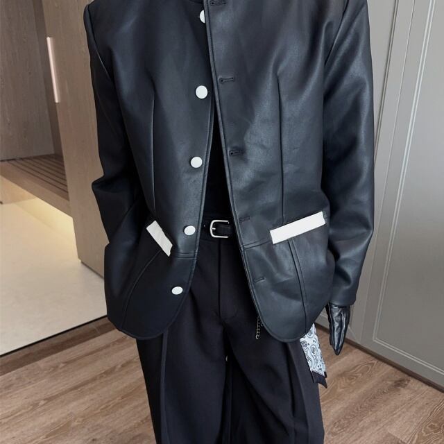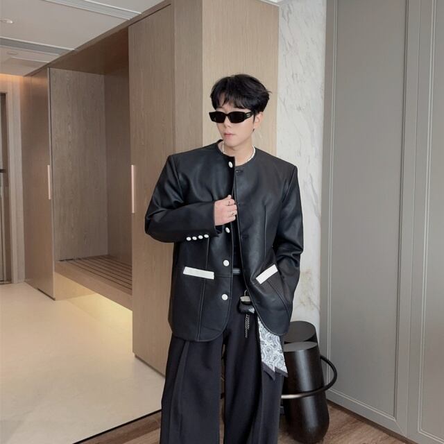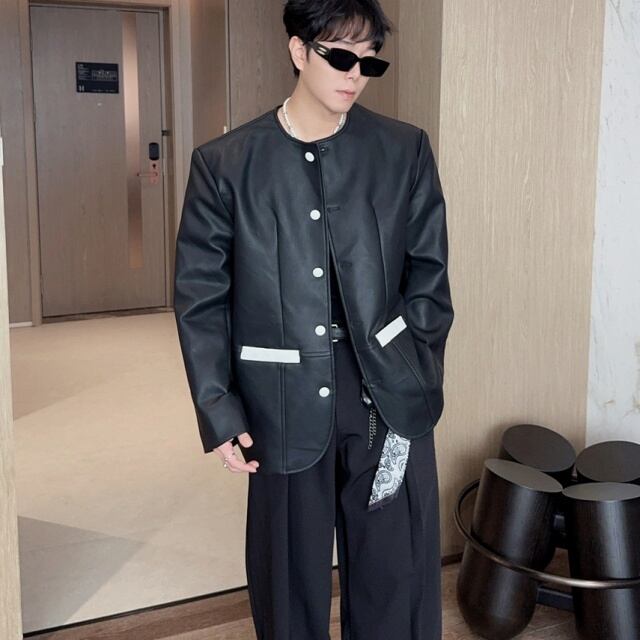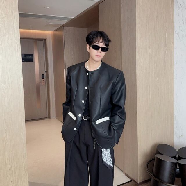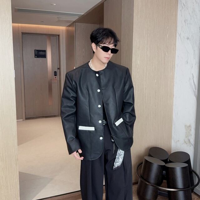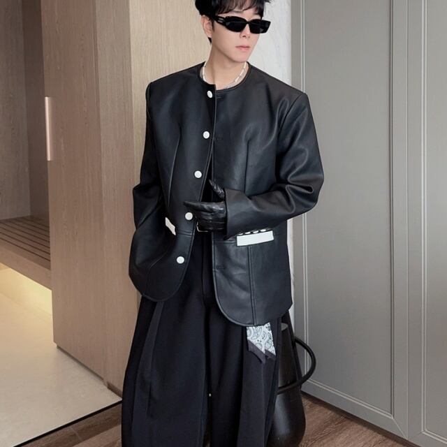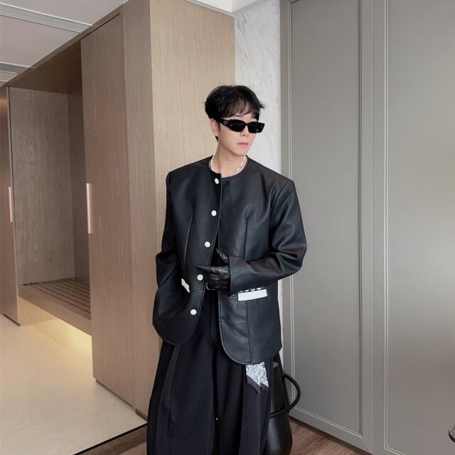 【予約販売】ジャケット レザー メンズ ブラック ショート丈 シック バイカラー ノーカラー こなれ感 お洒落 韓国 トレンド 結婚式 M/L/XL