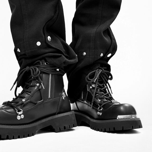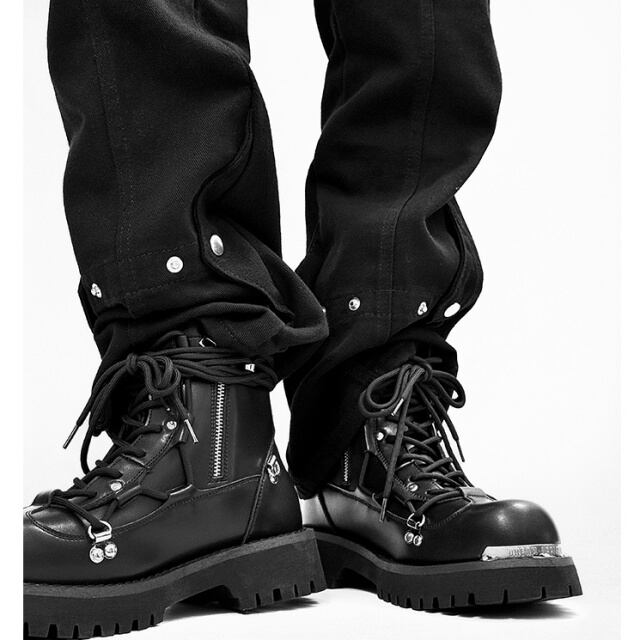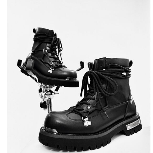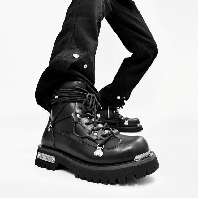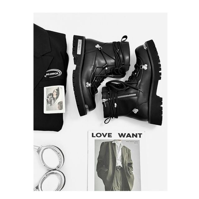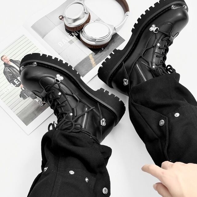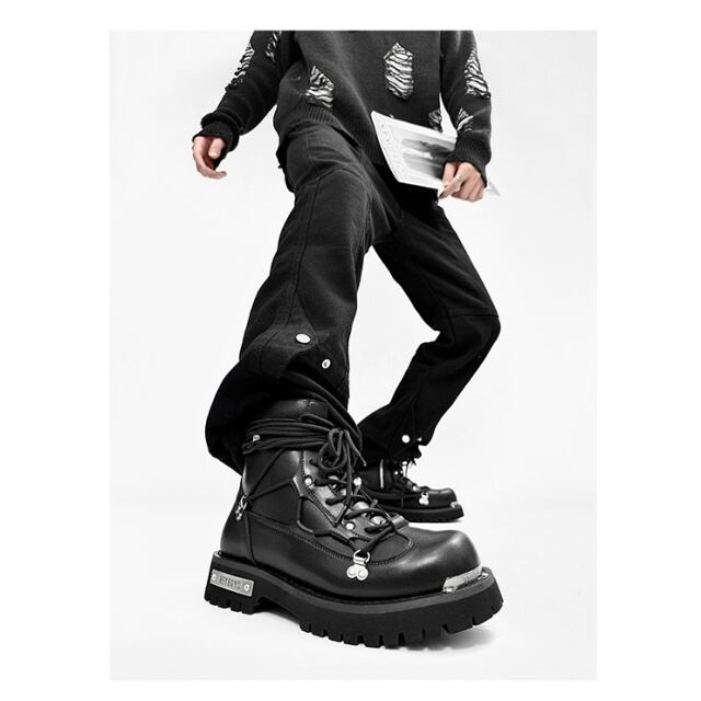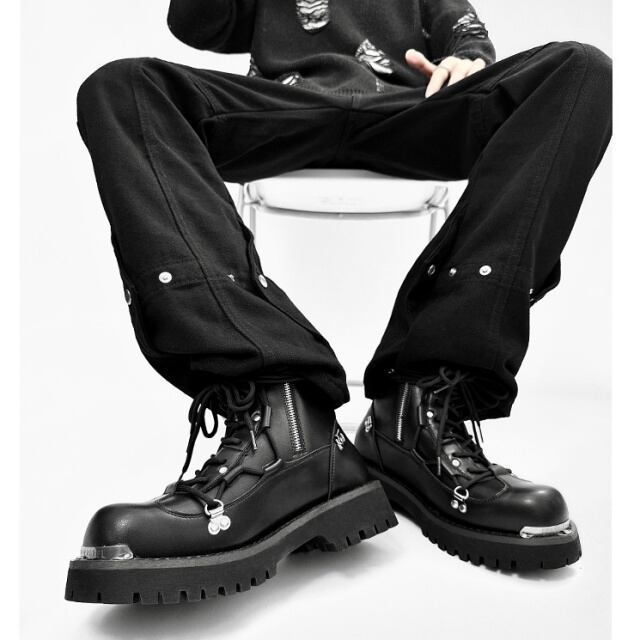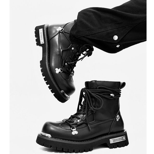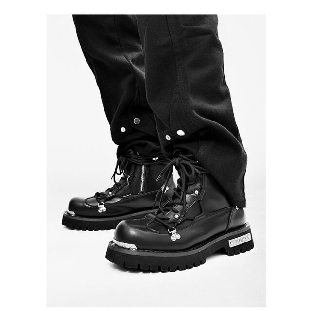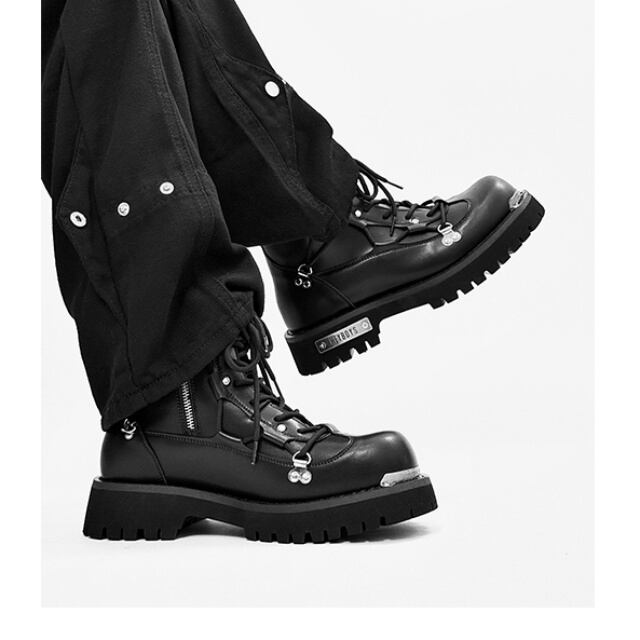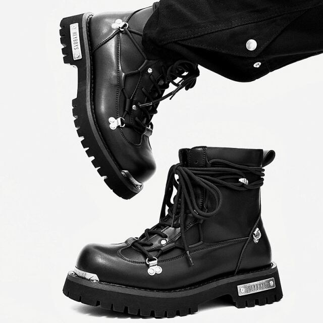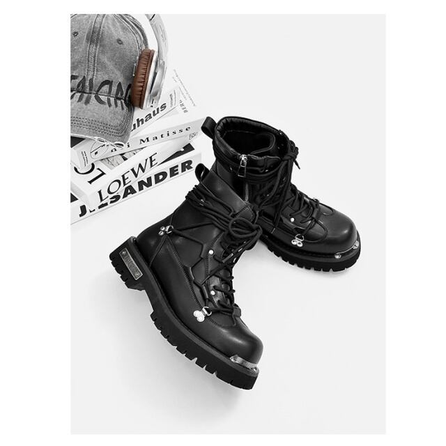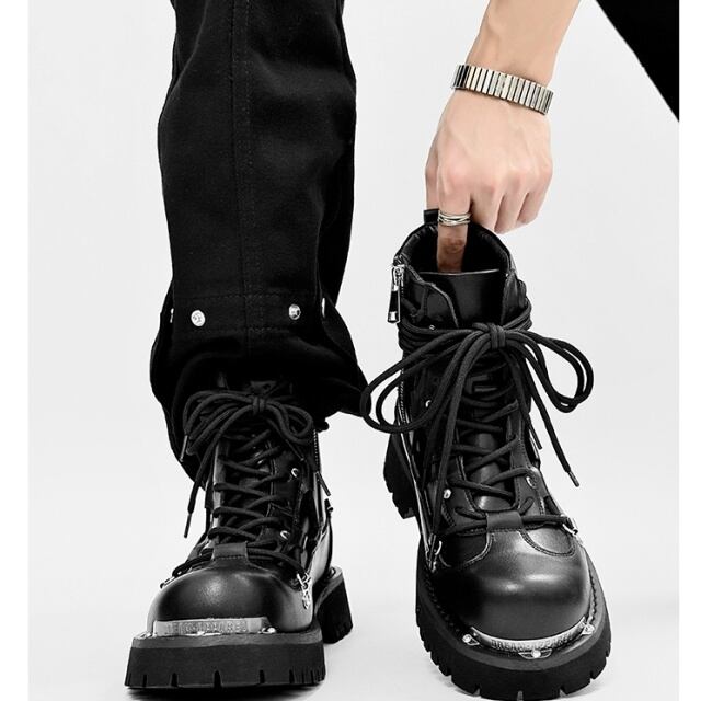 【予約販売】ブーツ レザー メンズ 編み上げ レースアップ メタル ゴツ底 厚底 靴 ブラック 黒 ハイカット お洒落 韓国 トレンド カジュアル 24cm/24.5cm/25cm/25.5cm/26cm/26.5cm/27cm