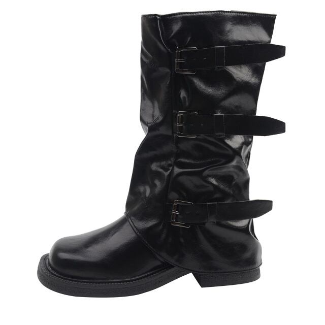 【予約販売】ブーツ レディース ブラック ブラウン レザー ベルト バックル 防寒 ミドル丈 厚底 ヒール カジュアル 可愛い トレンド 靴 お洒落 韓国 秋 冬 22.5cm/23cm/23.5cm/24cm/24.5cm/25cm