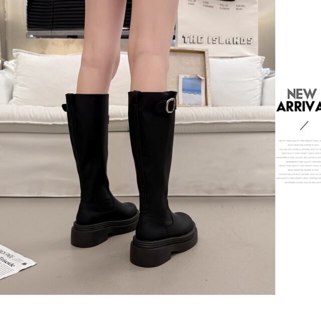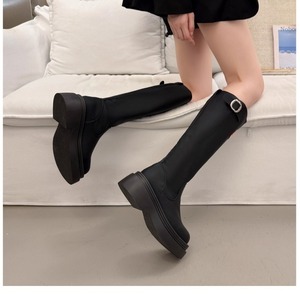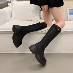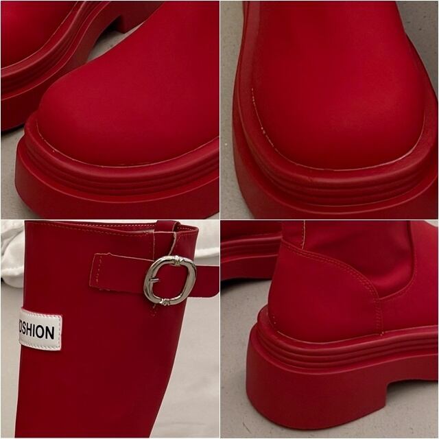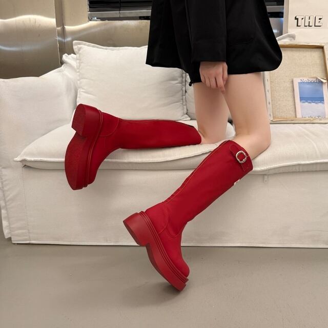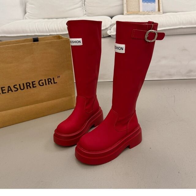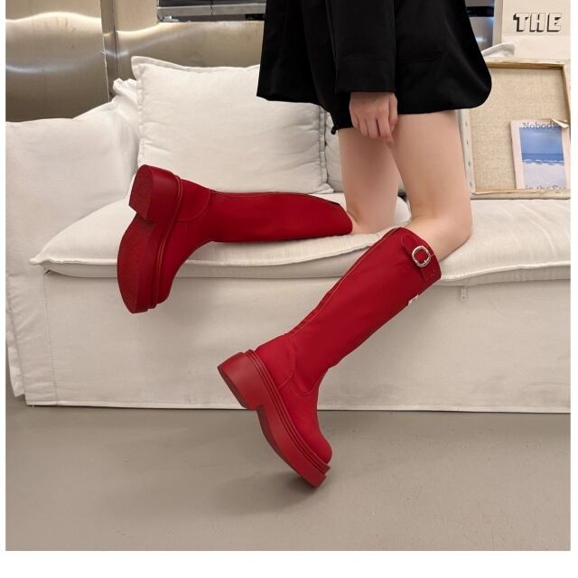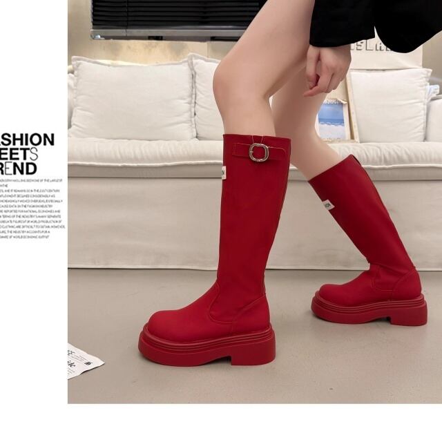 【予約販売】ブーツ レディース ブラック レッド スリム 防寒 ロング丈 厚底 ヒール カジュアル 可愛い トレンド 靴 お洒落 韓国 秋 冬 22.5cm/23cm/23.5cm/24cm/24.5cm/25cm