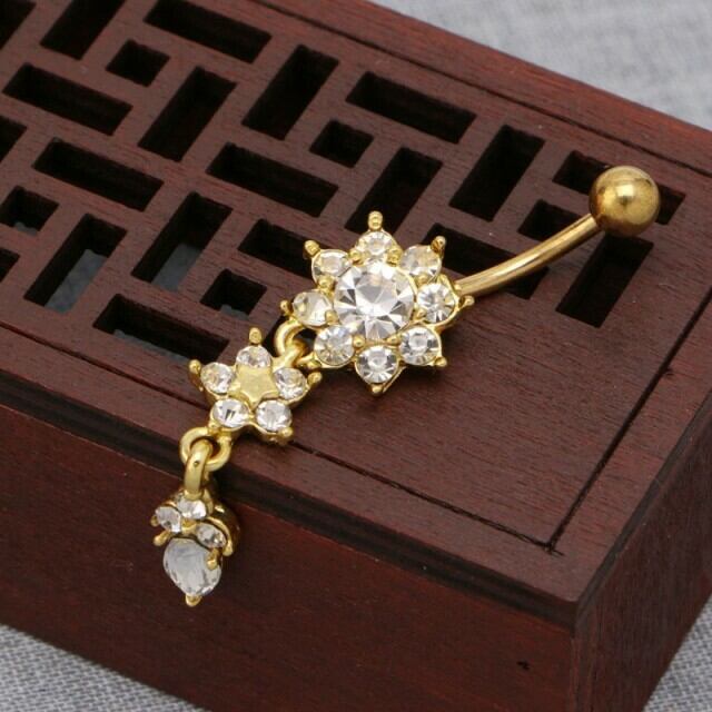 へそピアス 金属アレルギー 14g ヘソピ ビジュピアス ボディピアス フラワーモチーフ ラインストーン バナナバーベル ゴールド シルバー [A00154]