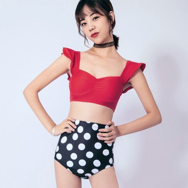 水着 レディース 体型カバー ビキニ 上下セット ドット柄 セクシー ハイウエスト フリル レースアップ 2点セット XL