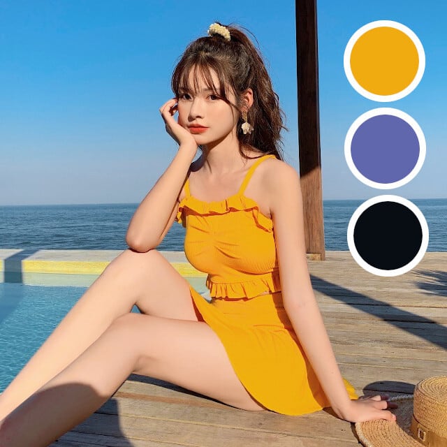 水着 レディース 体型カバー 上下セット タンキニ フリル ハイウエスト 2点セット セパレート ブラック イエロー パープル S/M/L/XL