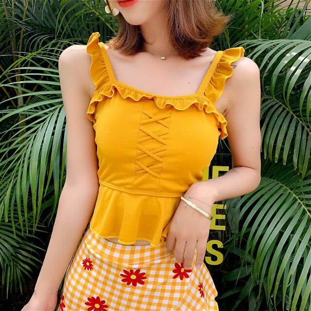 水着 レディース 体型カバー 上下セット 花柄 チェック タンキニ フリル ハイウエスト 2点セット セパレート イエロー グリーン S/M/L/XL