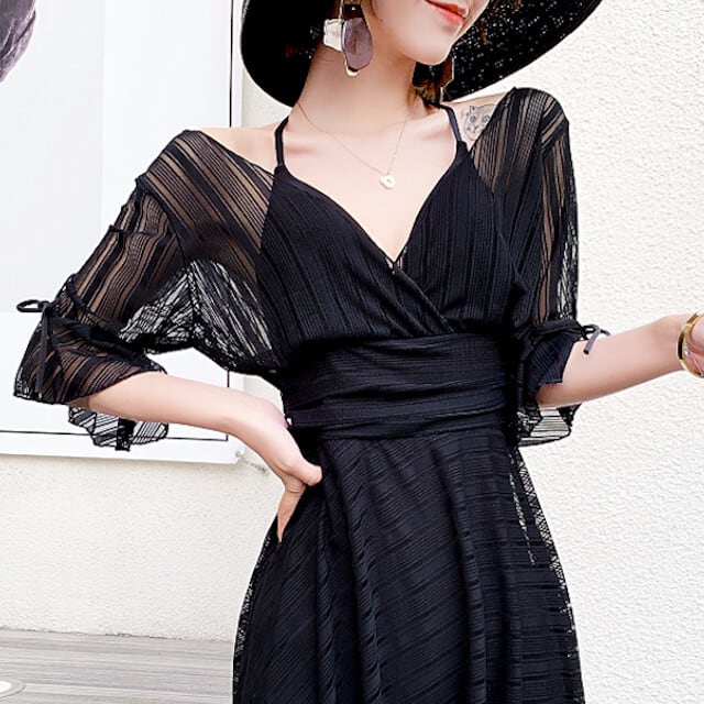 ワンピース水着 レディース 体型カバー フレア Vネック ストライプ ホルターネック ブラック/イエロー シースルー スイムウェア かわいい M/L/XL/2XL