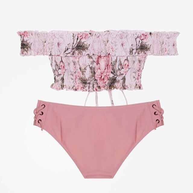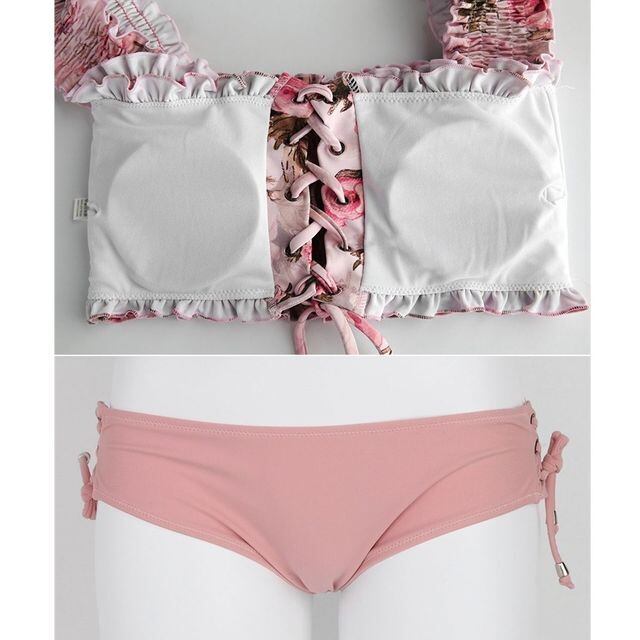 水着 レディース ビキニ 2点セット 花柄 オフショルダー レースアップ シャーリング 可愛い リゾート ピンク M/L/XL