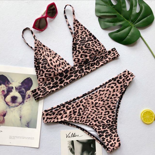 送料無料 水着 レディース ビキニ 2点セット レオパード柄 三角ビキニ ピンクベージュ セクシー リゾート S/M/L