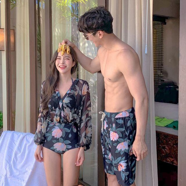 水着 カップル水着 ペアルック 水着 メンズ 水着 レディース 体型カバー 2点セット トップス フローラル ハイウエスト 海水パンツ ペア水着 恋人 おそろい お揃い 花柄 M/L/XL