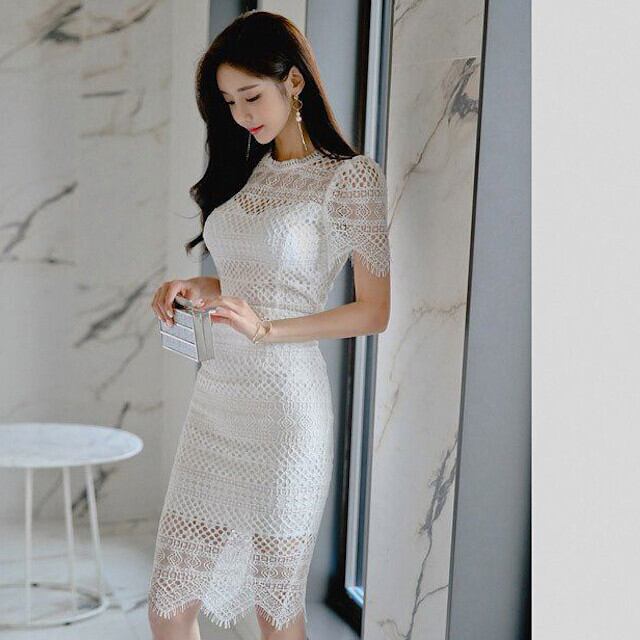 お呼ばれセットアップ パーティードレス オケージョン 2点セット フリンジレース 幾何学模様 半袖 トップス 膝丈 オフィス リゾートドレス エレガント ホワイト S/M/L/XL