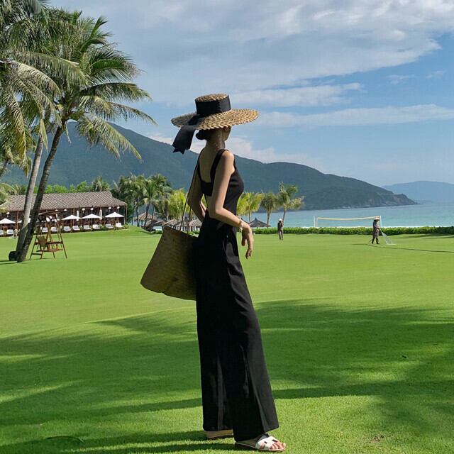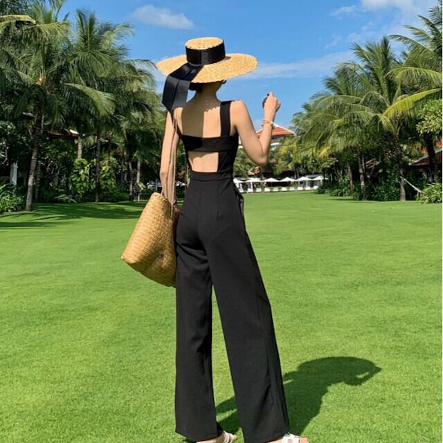 サロペット ブラック カットオフ 背中見せ ワイドパンツ チューブトップ風 スクエアネック バックシャン ワイドストレート リゾートドレス パーティー コンサバティブ S/M/L/XL
