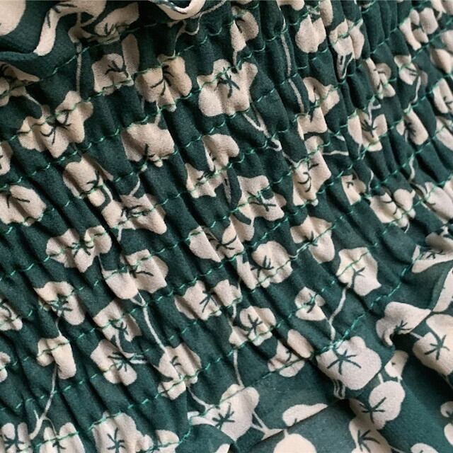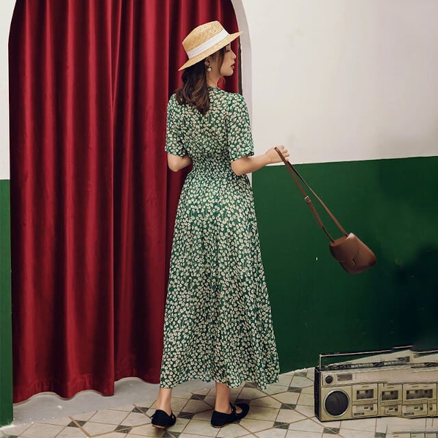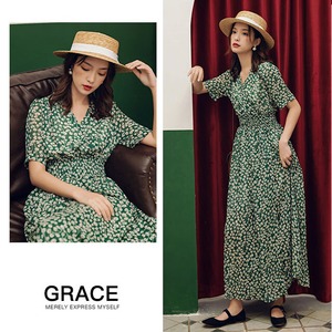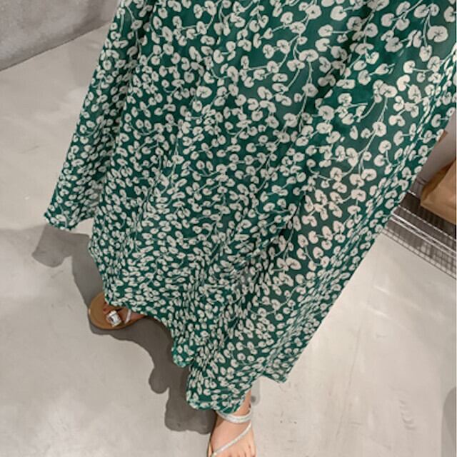 レディース ワンピース シアー シフォン ギャザー マキシ丈 カシュクール風 シャーリング ウエストシェイプ 花柄 バイカラー ベイクドカラー 半袖 Vネック Aライン フレア グリーン S/M/L/XL