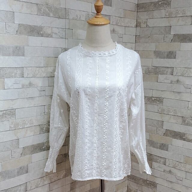 トップス ブラウス シャツ 刺繍 パンチングレース ガーリー 白 長袖 クルーネック スタンドカラー ノーカラー ロングカフス シャーリング テープレース ドロップショルダー シャツ ホワイト 花柄 ボリューム袖 S/M/L/XL