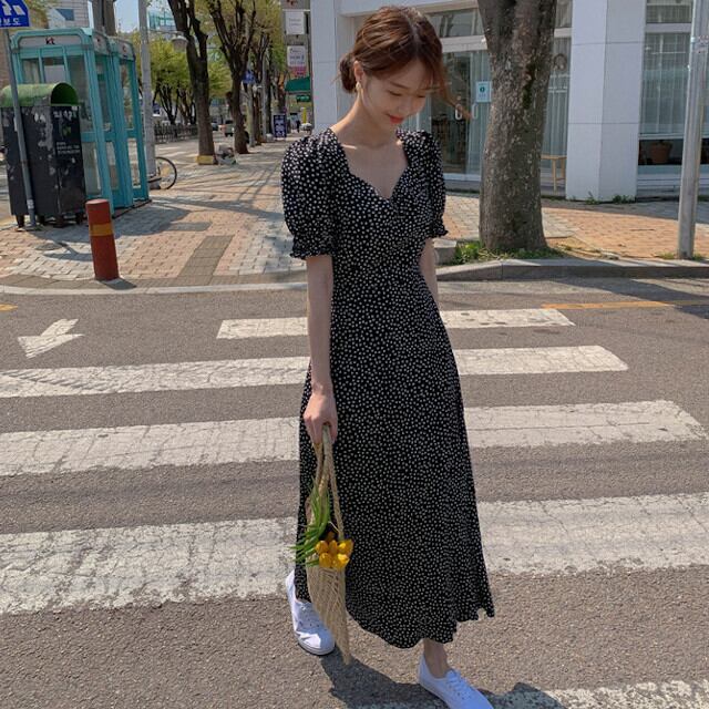 カジュアルワンピース 小花 モノトーン マキシ パフスリーブ スイートハートネック 花柄 フラワー バイカラー モノトーン ロング 半袖 五分袖 パフスリーブ Aライン フレア マキシ S/M/L/XL