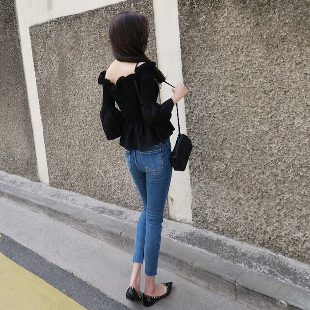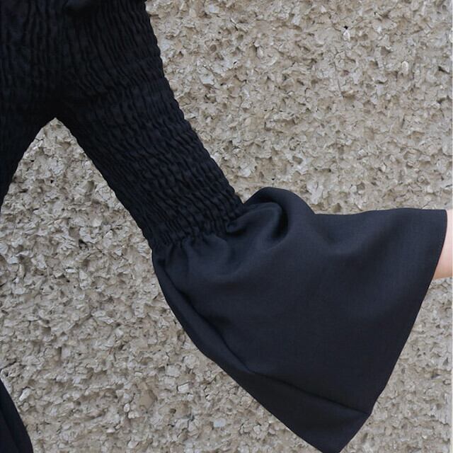 カジュアルブラウス フリル ボリューム袖 袖コンシャス シンプル セクシー 無地 オフショルダー 七分袖 ブラック フリーサイズ