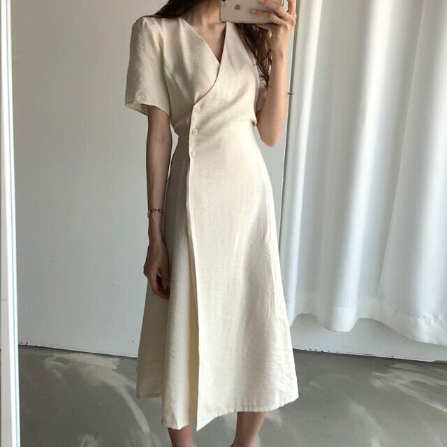 ワンピース 2色 ミディ丈 ラップドレス アシメデザイン 膝下丈 ベーシック エレガント フェミニン 無地 半袖 Vネック ホワイト/ネイビー S/M/L/XL