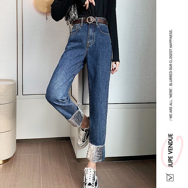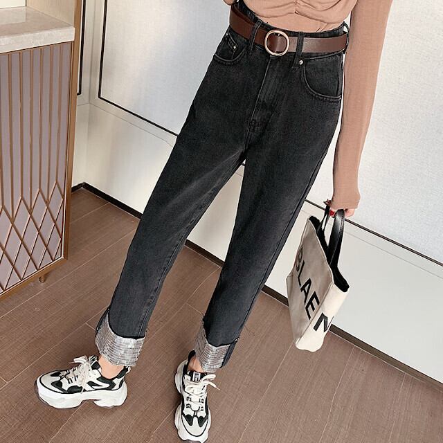 ボトムス デニム ジーパン スパンコール ハイライズヴィンテージ ハイウエスト キラキラ 脚長効果 ワイドストレート ロールアップ 九分丈パンツ ジーンズ Gパン こなれ感 S/M/L/XL