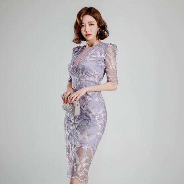 お呼ばれワンピース ドレス ミディアム シースルー 深Vネック風 ペールカラー パステルカラー ラベンダー フリンジレース ハイウエスト ミディ丈 膝丈 花柄 シースルー 半袖 パフスリーブタイト S/M/L/XL
