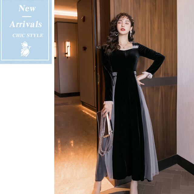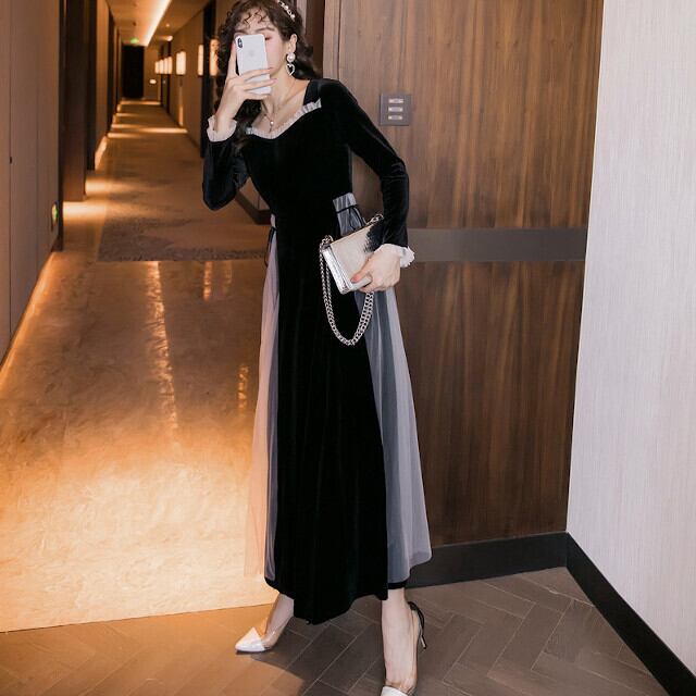 お呼ばれワンピース ドレス ロング 異素材ミックス リボン フリル シアー バイカラー 無地 シースルー ロング 長袖:Aライン フレア マキシ ブラック S/M/L/XL