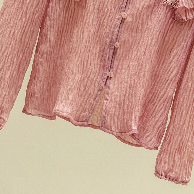 レディース トップス ブラウス シャツ シアー フリル 肩コンシャス シワ加工 テラコッタ ベイクドカラー 長袖 ウィンドカフス Vネック ノーカラー S/M/L/XL/2XL