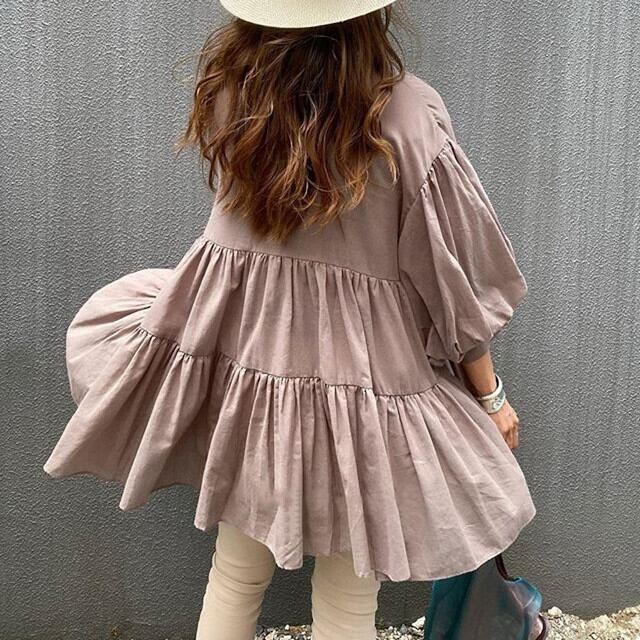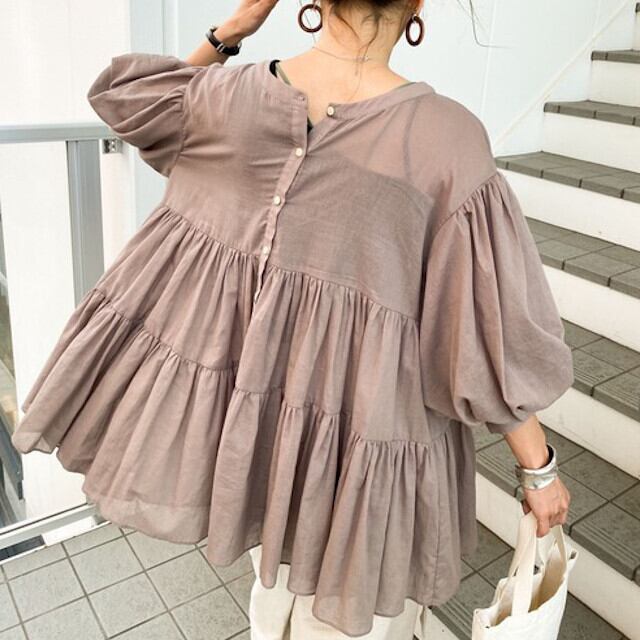 レディース トップス チュニック シアー ティアード ギャザー ゆったり 無地 シアー くすみカラー 七分袖 ドロップショルダー オーバーショルダー パフスリーブ ボリューム袖 パープル/グリーン/クリーム