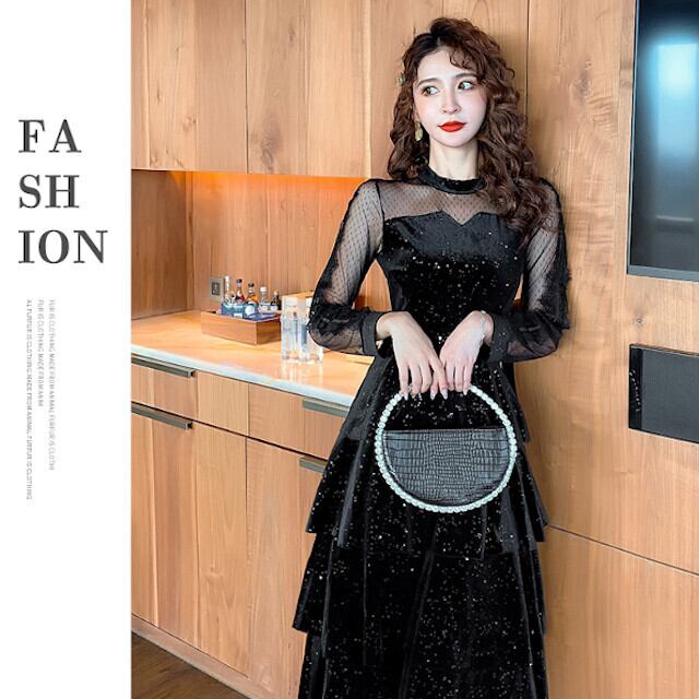 お呼ばれワンピース ドレス ロング 肌見せ シースルー ティアー チュール レース フリンジレース ドット グリッター ロング ハイネック Aライン aフレア ブラック S/M/L/XL/2XL