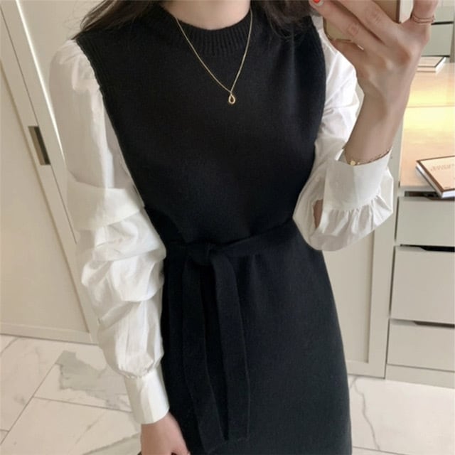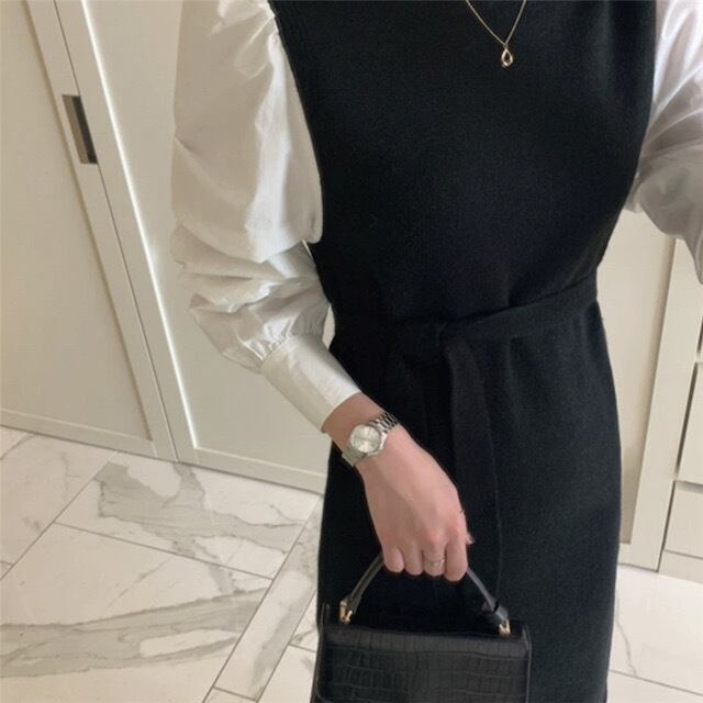 【予約販売】ワンピース ニットワンピ ニットワンピース 長袖 秋 冬 無地 配色ワンピース 黒 キャメル