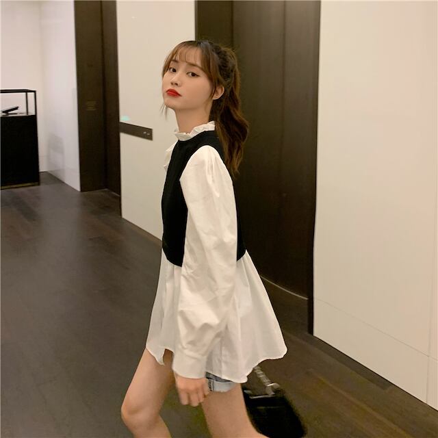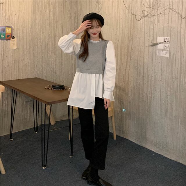 【予約販売】ブラウス レディース 長袖 カジュアル ベスト 重ね着 ボリューム袖 ベストレイヤード風 フレアブラウス グレー/ブラック