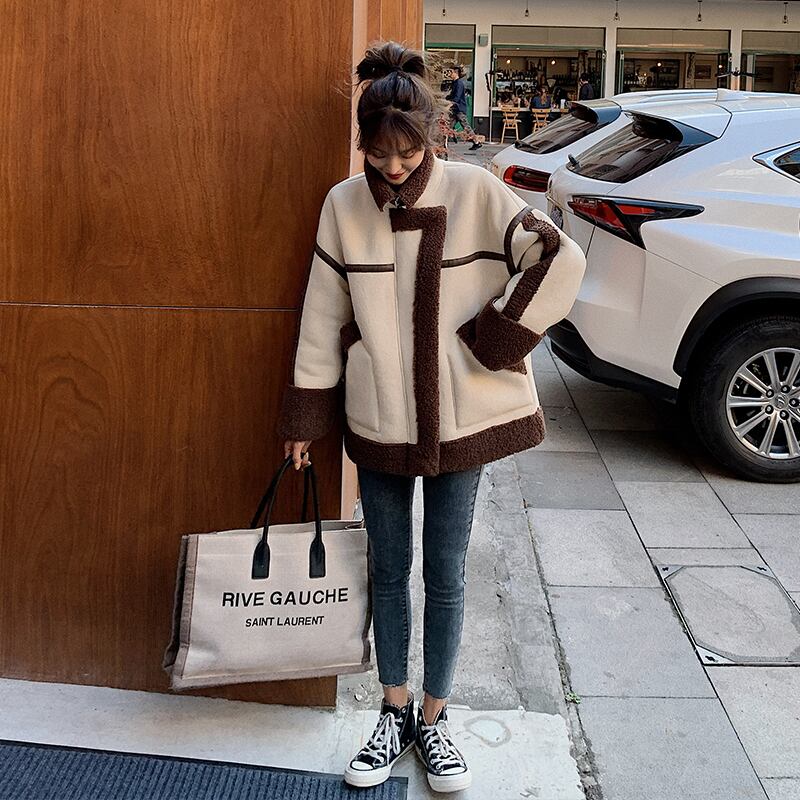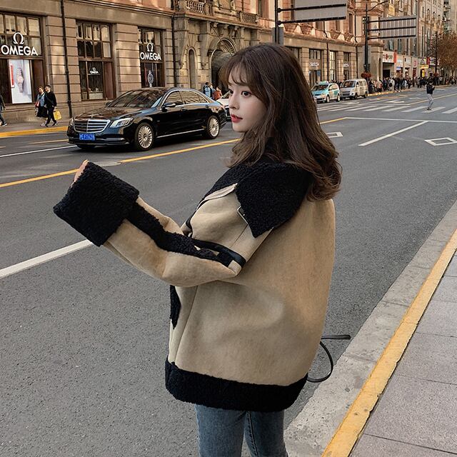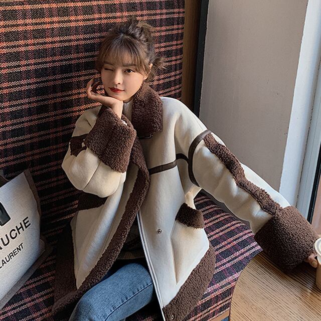 【予約販売】コート レディース 秋冬 バイカラージャケット ボア 裏ボア スエード デザイン パイピング ミドル丈 アウター トップス S,M,L ゆったり ルーズ シンプル 無地 ボリューム