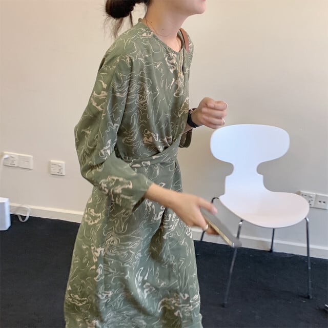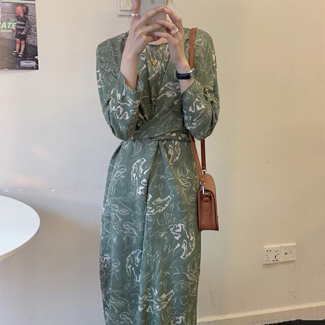レディース ワンピース クロスデザイン ノーカラー Aライン バイカラー くすみカラー グリーン クルーネック ノーカラー Aライン フレア カジュアル ひざ下丈 ミモレ丈