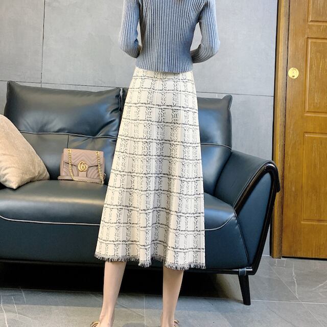 【予約販売】スカート ミモレ丈スカート ニットスカート ツイードスカート 秋冬 フレアスカート Aラインスカート ホワイト/ブラック/ブラウン