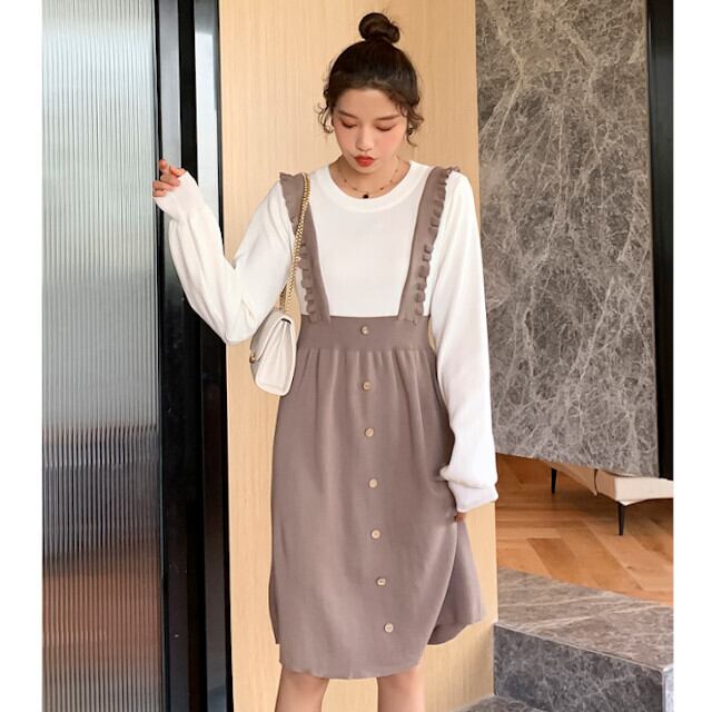 レディース カジュアルワンピース ドッキング リブニット ハイウエスト バイカラー 無地 モノトーン 長袖 ノーカラー Aライン ブラック/コーヒー
