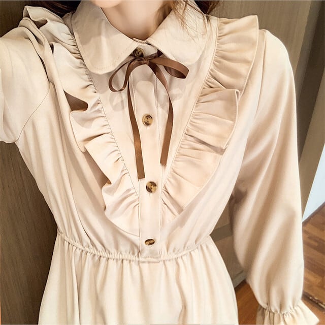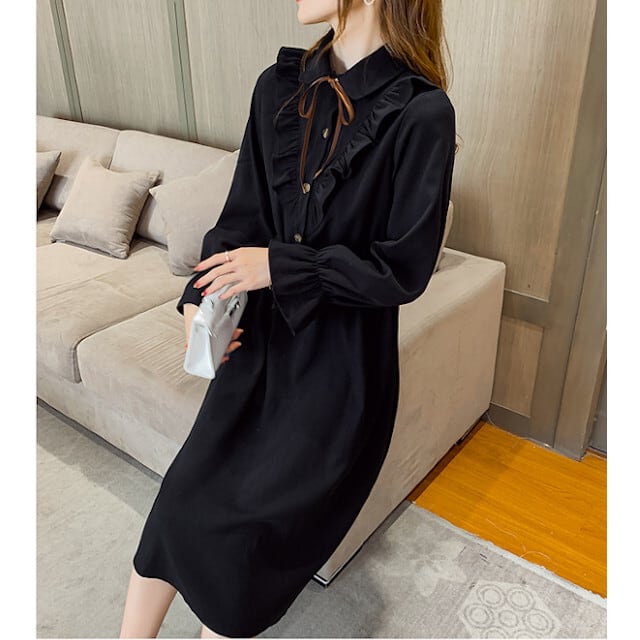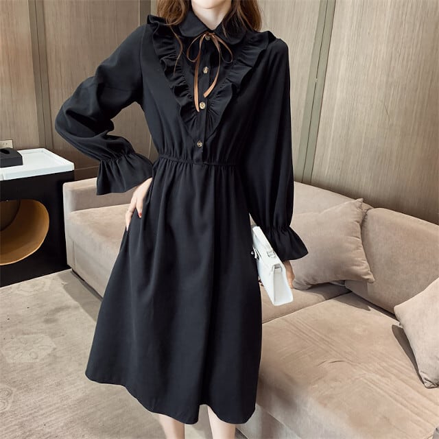 ワンピース レディース Aライン リボン フリル 丸襟 エクステンションカフス ドールワンピ 無地 長袖 Aライン フレア シャツワンピース サイズ展開豊富 ブラック/アプリコット S/M/L/XL/2XL