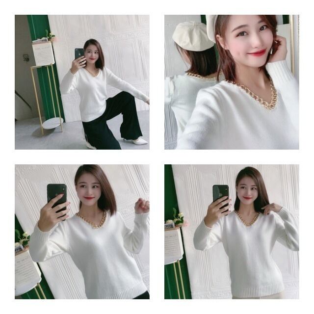 【予約販売】セーター レディース 秋 冬 Vネック セーター チェーン ネックレス付き ホワイト ブラック