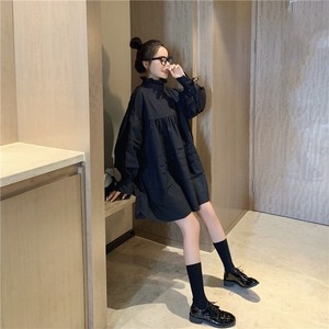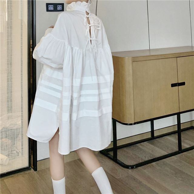【予約販売】フリル ブラウス シャツ ハイネック ドール Aライン ワンピース バック リボン パフスリーブ 春秋 レディース ブラック ホワイト