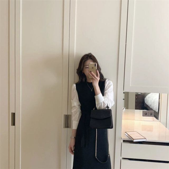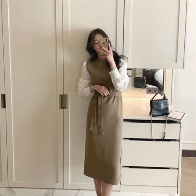 【予約販売】フェイクレイヤード ニット セーター ワンピース バルーンニットワンピース ロング ブラウス シャツ 切り替え 重ね着風 ベージュ ブラック