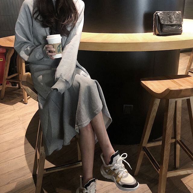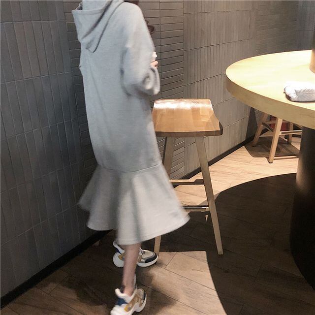 【予約販売】スウェット ワンピース フード ロング フリル カジュアル レディース 秋冬 グレー