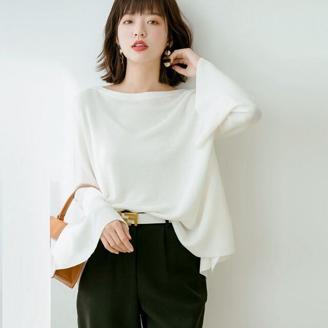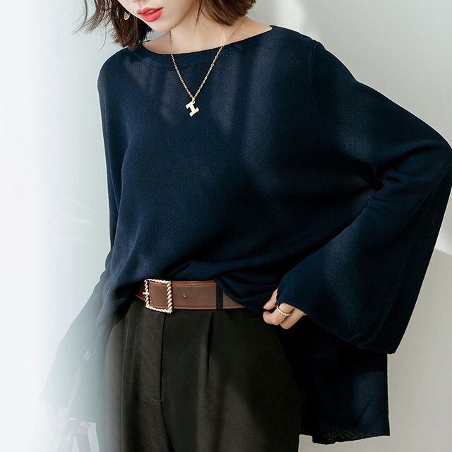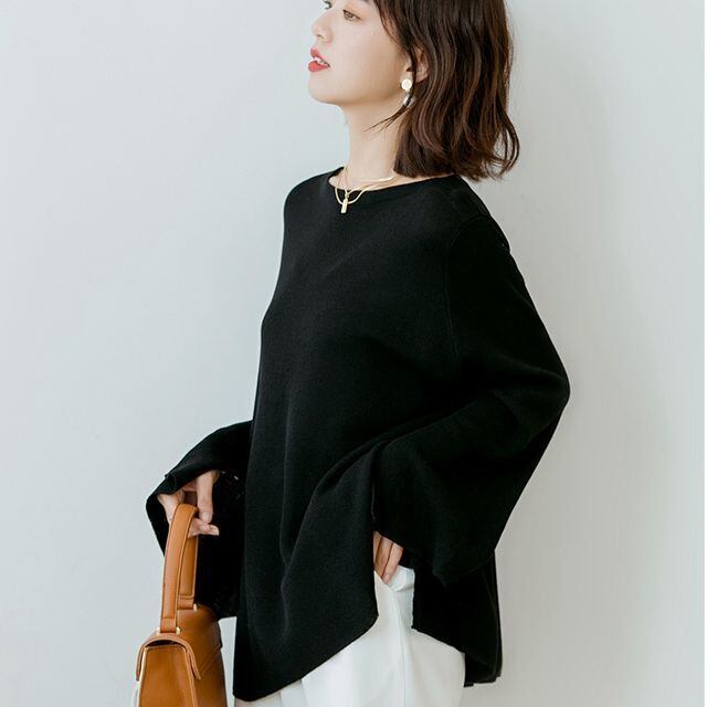 【予約販売】トップス レディース 秋冬 とろみ感 ブラウス フレア袖 長袖 ベルスリーブ スリット こなれ感 プルオーバー 無地 大人可愛い M/L ピンク/ホワイト/ブラック/ネイビー/ベージュ