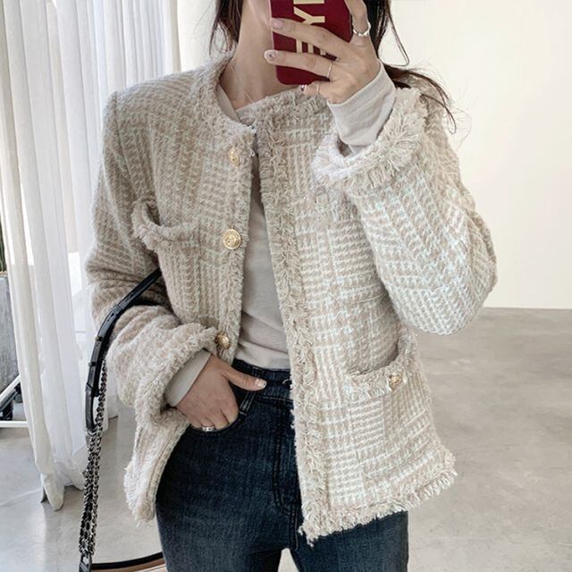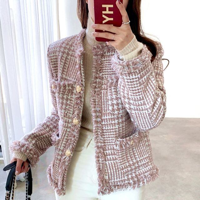 【予約販売】ツイード ジャケット レディース 秋冬 フリンジ ノーカラー 長袖 エレガント 上品 大人可愛い S/M/L ベージュ/ピンク