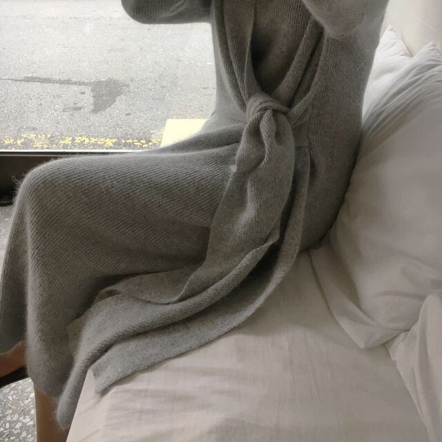【予約販売】ニットワンピース レディース ロング丈 Vネック 前縛り モヘア ホワイト グレー ゆったり きれいめ 秋冬 ワンピ 大人可愛い エレガント おしゃれ こなれ感 韓国