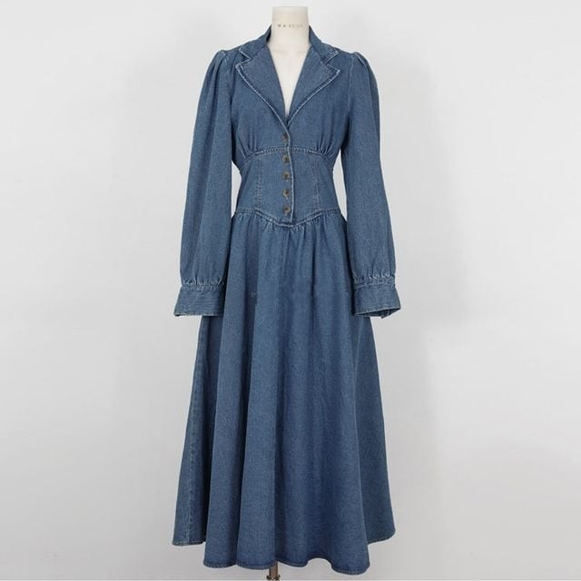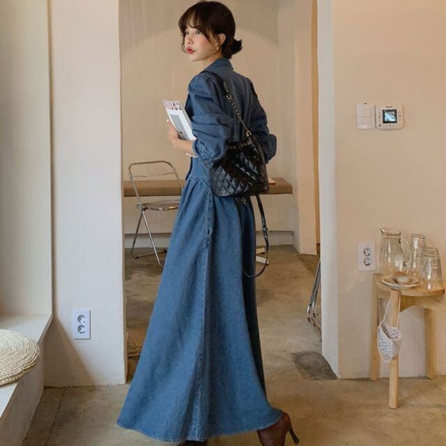 【予約販売】デニムワンピース レディース ロング丈 Vネック Aライン 細見え カジュアル きれいめ 秋冬 ワンピ 大人可愛い エレガント おしゃれ こなれ感 韓国