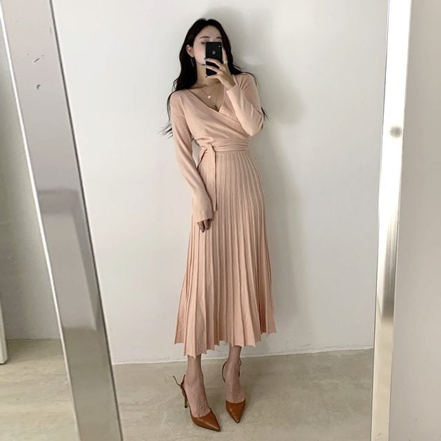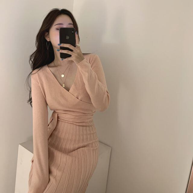 【予約販売】ニットワンピース プリーツ レディース カシュクール Vネック 細見え ピンク ブラック ベージュ きれいめ 秋冬 ワンピ 大人可愛い エレガント おしゃれ こなれ感 韓国